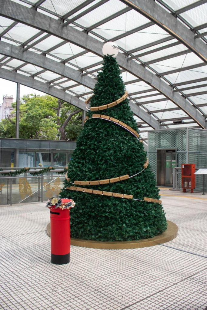 El árbol, de 4 metros de altura y con adornos en forma de vagones de subte, está ubicado debajo del domo vidriado de la estación. Además, se colocó un buzón para que puedan dejar su carta a Papá Noel.